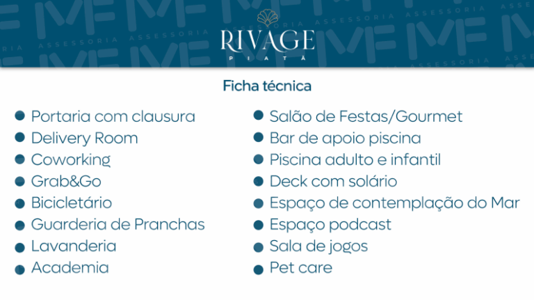 O Rivage Piatã é um empreendimento de alto padrão em Salvador, atualmente em fase de lançamento e com boa velocidade de vendas. O projeto recebeu nota máxima em localização, por estar situado de frente para o mar em uma das praias mais valorizadas da cidade, Piatã.