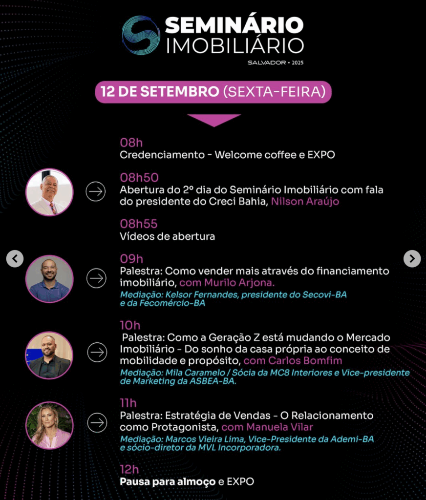 O evento, que terá como tema “Tecnologia impacta. Conhecimento transforma”, reunirá mais de mil corretores credenciados, além de autoridades e empresários de destaque do mercado imobiliário baiano, um setor que é referência nacional em mobilização de recursos e geração de empregos.